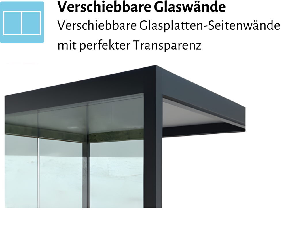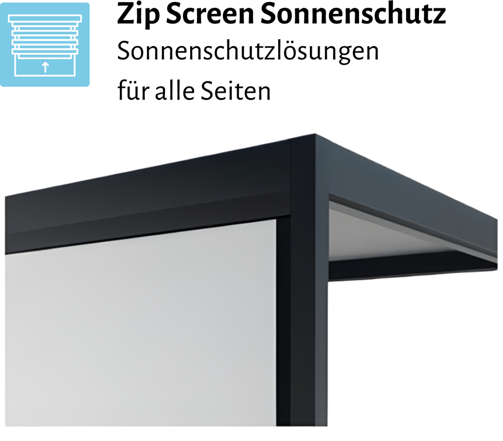 - Optional integrierbare Komfortelemente: Heizstrahler, lineare LED-Beleuchtung, ZIP-Screen-Seitenbeschattungen, feste Lamellenpaneele und Schiebewände aus Glas