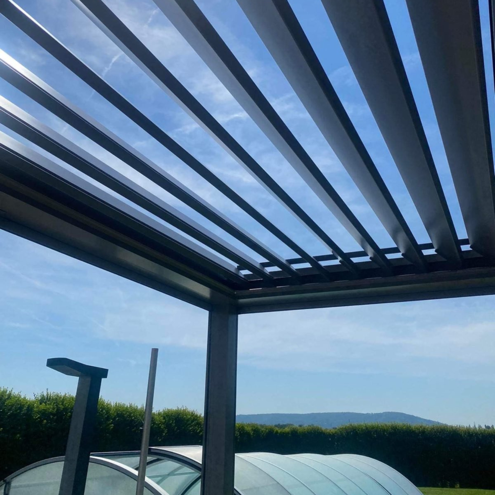 - a pergola teteje mozgatható, kamrás alumínium lamellákból áll