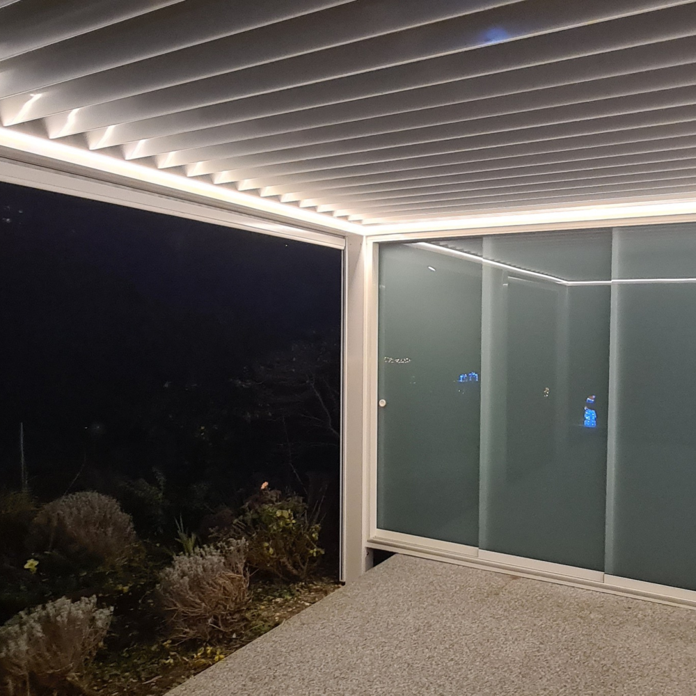 - beépíthető kényelmi elemek: hősugárzó, LED lineáris világítás, Zip Screen oldalsó árnyékolók, fix lamellás panelek és eltolható üvegfalak