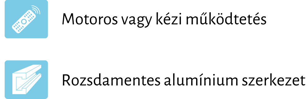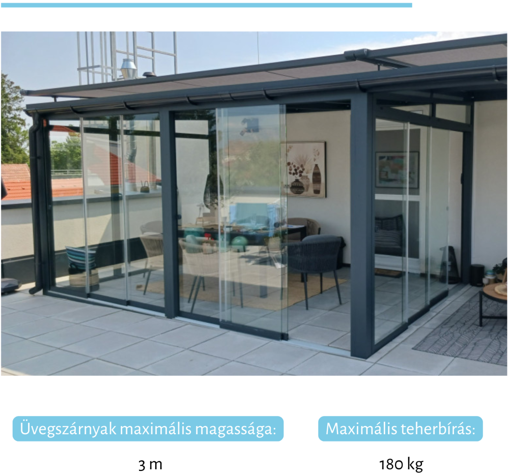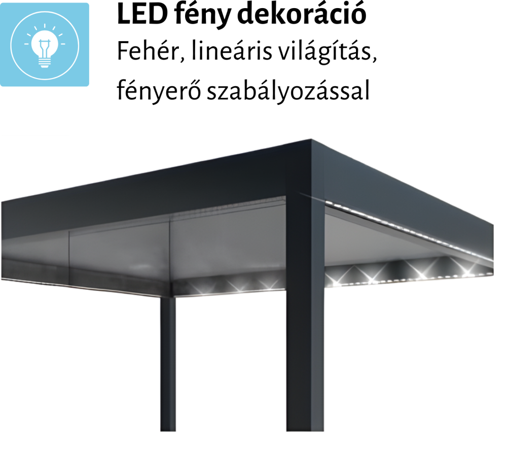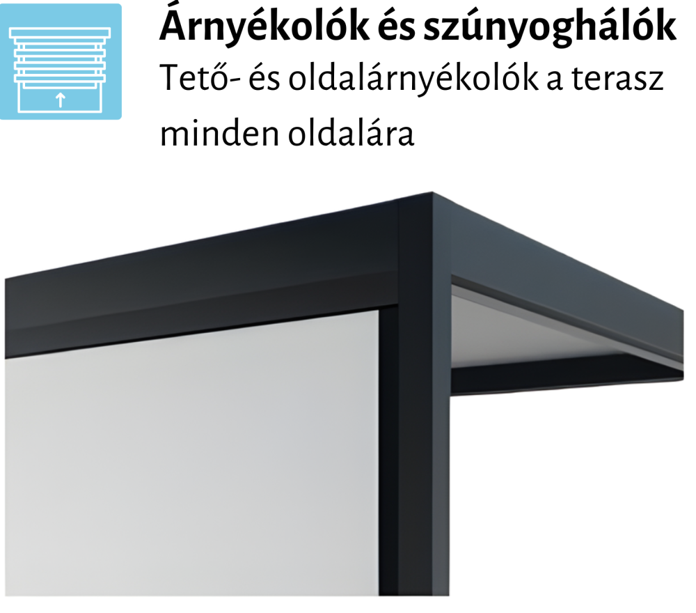 - Beépíthető kényelmi elemek: hősugárzó, LED lineáris világítás, tető- és oldalsó árnyékolók, fix lamellás panelek, szúnyogháló, eltolható üvegfalak